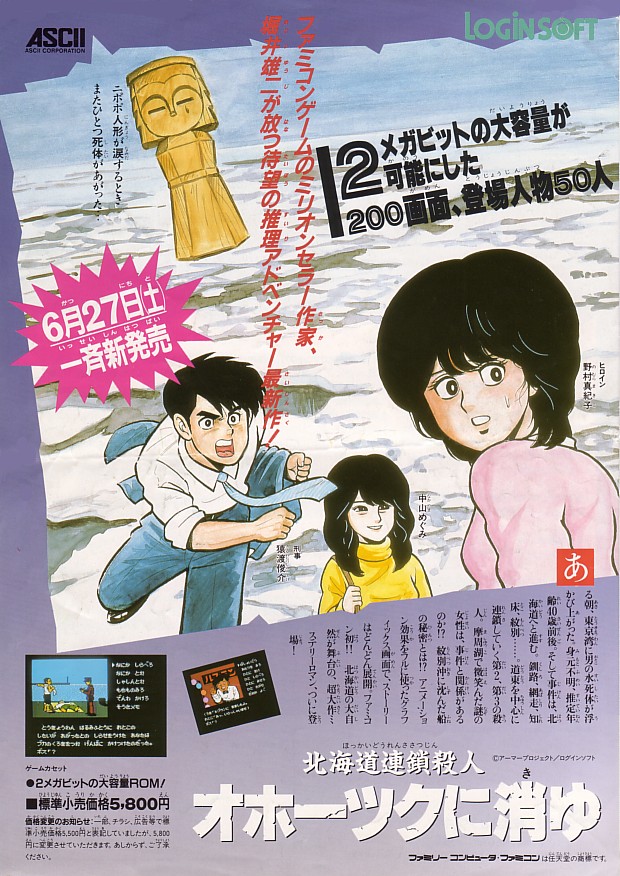 ポートピアと同じく堀井雄二ミステリー3部作の1つで、北海道の摩周湖や屈斜路湖、網走刑務所など観光名所を巡ることから、まるで著名作家が執筆するようなストーリーだと絶賛されました。秀逸!PC版パッケージ